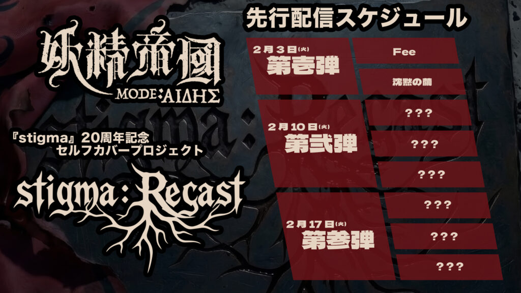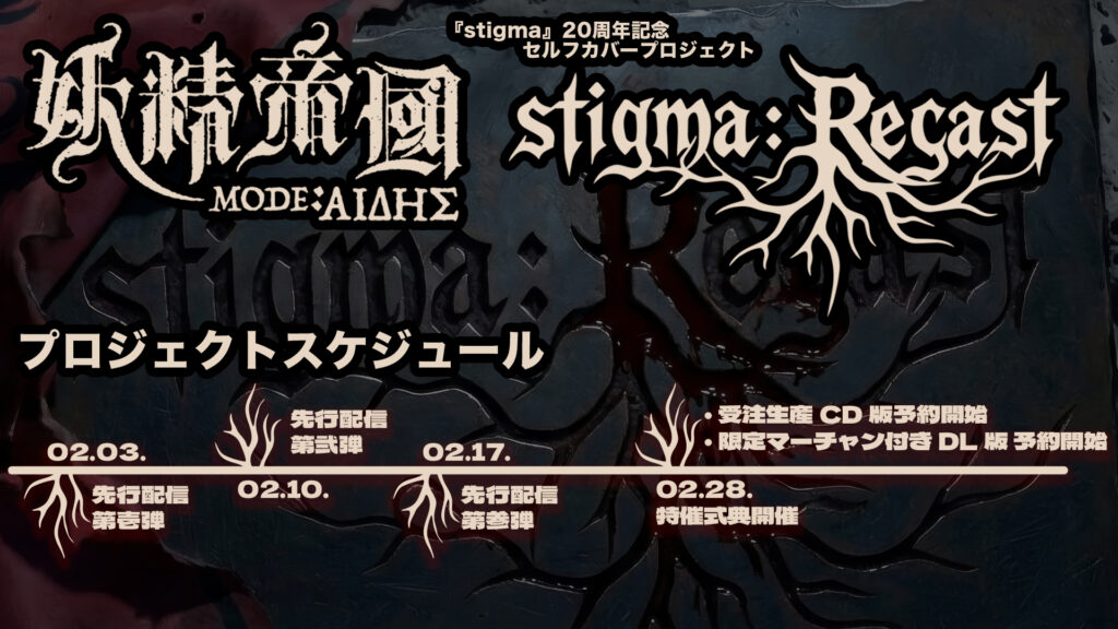 臣民諸君。 妖精帝國の歴史において重要な転換点となったアルバム『stigma』のリリースから20年。 この記念すべき年に、全楽曲を現代の解釈で再構築するセルフカバープロジェクト『stigma:Recast』が始動した。